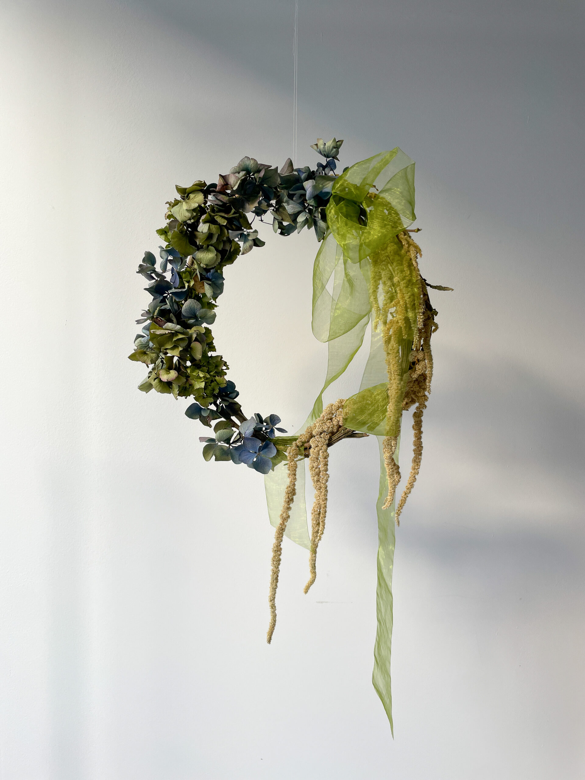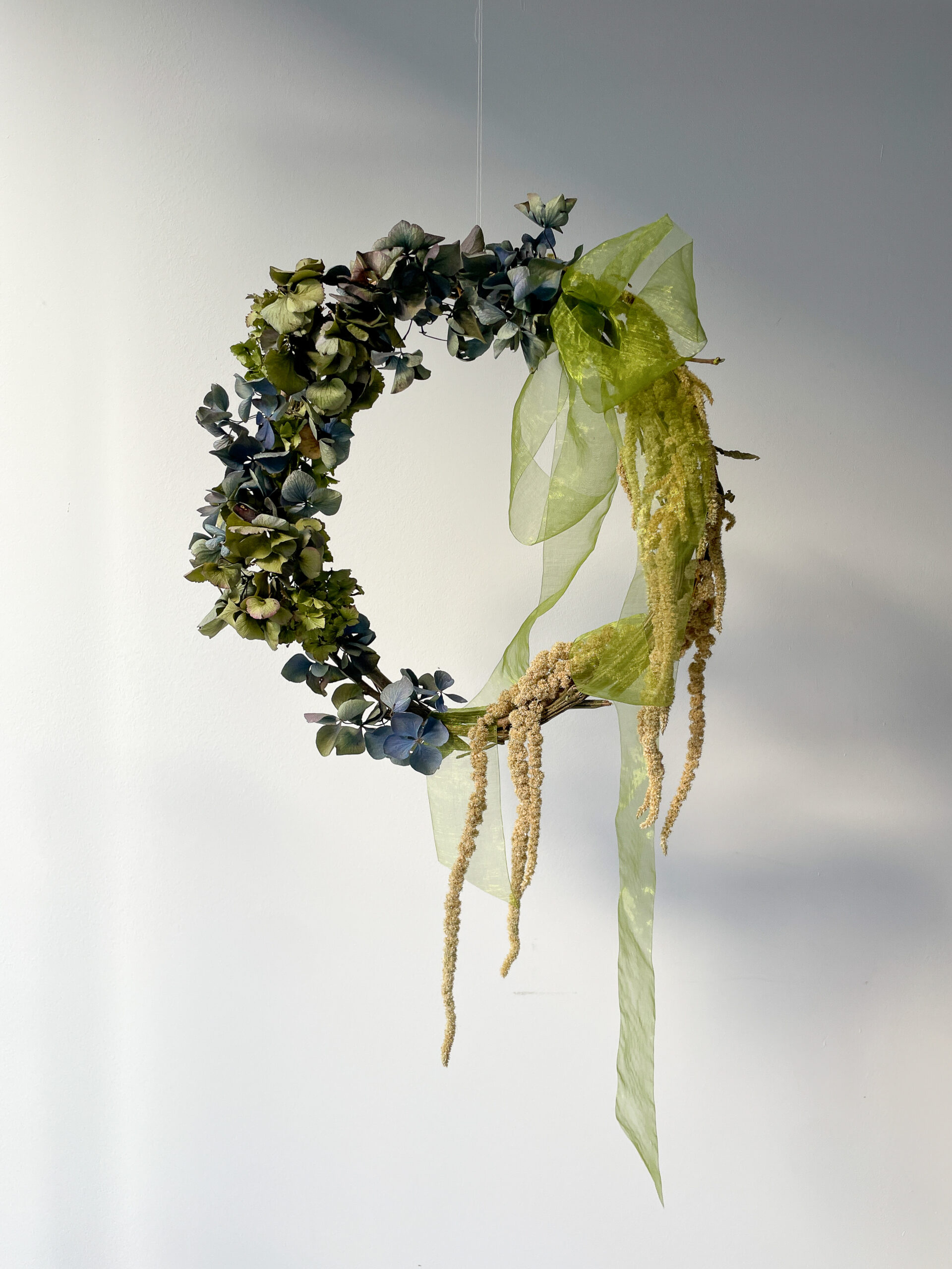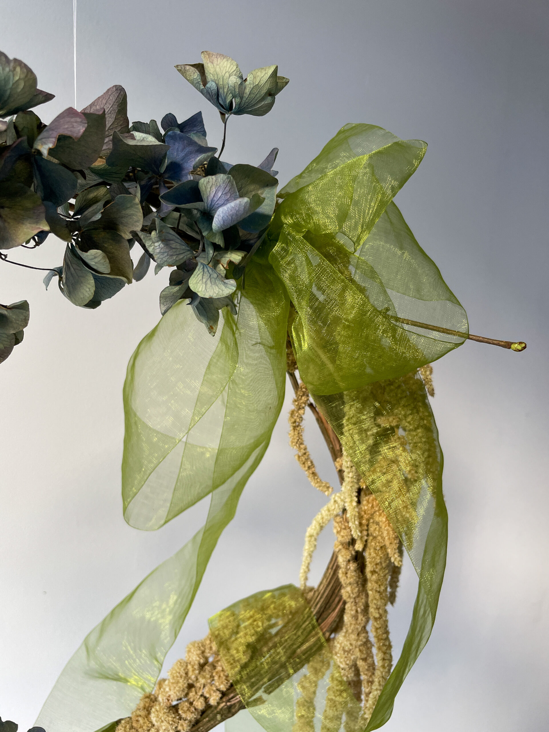 A handmade base created from British monkey vine and hazel comes with dried hydrangea in green and two-tone blue-lilac plus trailing amaranthus – all from Hampshire, Cornwall, Norfolk and Lincolnshire. Kits also include a luxuriously long, sheer organza ribbon in lime green. You’ll receive everything you need to make this beautiful dried flower wreath, including a handy guide. Please read all information below, before placing your order. Dried flower wreaths are not suitable for outdoor use.